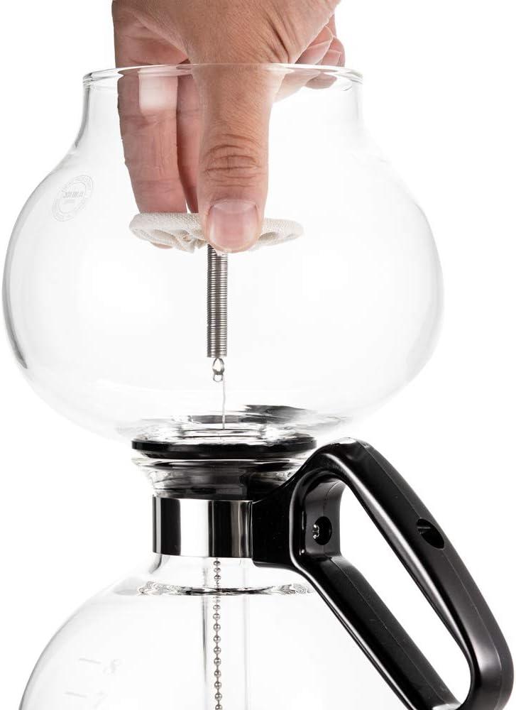 When you carry the assembled siphon to the stove it reads more like a small experiment than an ordinary pot: clear glass catching kitchen light, the upper and lower chambers stacked like laboratory glassware, and a short chain or fabric filter dangling inside the tube. Placing it on the burner, you notice the metal trivet under the glass and the little area it needs to sit squarely; on a compact cooktop the whole setup can feel like it demands a deliberate clearing of nearby pans. At a glance you’ll see a few consistent visual cues that mark the moment it’s on heat: